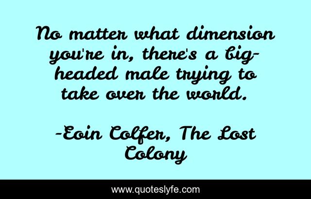 This page presents the quote "No matter what dimension you're in, there's a big-headed male trying to take over the world.". Author of this quote is Eoin Colfer, The Lost Colony. This quote is about men, humor,.