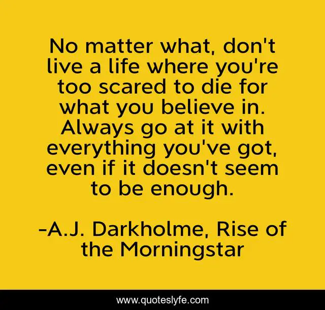 This page presents the quote "No matter what, don't live a life where you're too scared to die for what you believe in. Always go at it with everything you've got, even if it doesn't seem to be enough.". Author of this quote is A.J. Darkholme, Rise of the Morningstar. This quote is about confidence, belief, insecurity, scared, prepared, confident, act, action, fear,.