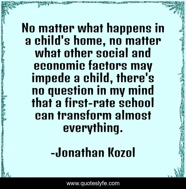 This page presents the quote "No matter what happens in a child's home, no matter what other social and economic factors may impede a child, there's no question in my mind that a first-rate school can transform almost everything.". Author of this quote is Jonathan Kozol. This quote is about school, mind, child,.
