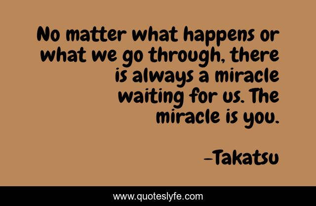 This page presents the quote "No matter what happens or what we go through, there is always a miracle waiting for us. The miracle is you.". Author of this quote is Takatsu. This quote is about life, quote, philosophy, miracle, quotes-on-life, inspirational, quotes-to-live-by, enthusiasm, inspiration,.