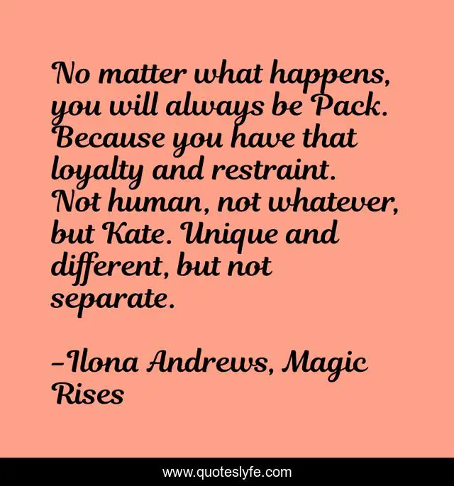 This page presents the quote "No matter what happens, you will always be Pack. Because you have that loyalty and restraint. Not human, not whatever, but Kate. Unique and different, but not separate.". Author of this quote is Ilona Andrews, Magic Rises. .