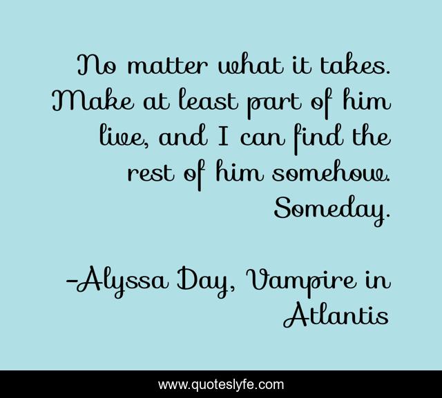 This page presents the quote "No matter what it takes. Make at least part of him live, and I can find the rest of him somehow. Someday.". Author of this quote is Alyssa Day, Vampire in Atlantis. This quote is about alyssa, atlantis, vampire, day, in,.