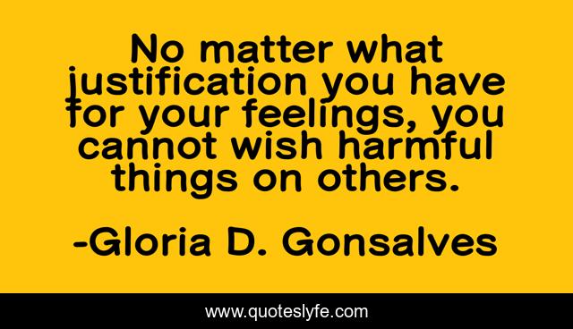 This page presents the quote "No matter what justification you have for your feelings, you cannot wish harmful things on others.". Author of this quote is Gloria D. Gonsalves. This quote is about peace-of-mind, peace, peace-on-earth,.