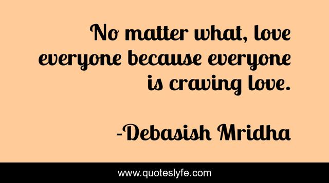 This page presents the quote "No matter what, love everyone because everyone is craving love.". Author of this quote is Debasish Mridha. This quote is about love, everyone-is-craving-love, philosophy, debasish-mridha, quotes, inspirational, enthusiasm, love-everyone, debasish-mridha-m-d,.
