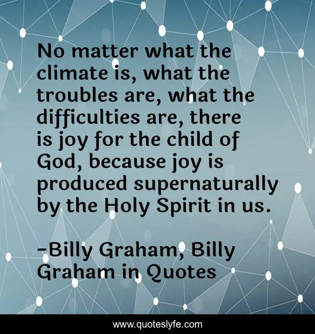 This page presents the quote "No matter what the climate is, what the troubles are, what the difficulties are, there is joy for the child of God, because joy is produced supernaturally by the Holy Spirit in us.". Author of this quote is Billy Graham, Billy Graham in Quotes. This quote is about joy, billy-graham,.