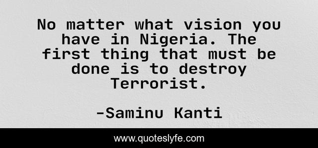 This page presents the quote "No matter what vision you have in Nigeria. The first thing that must be done is to destroy Terrorist.". Author of this quote is Saminu Kanti. This quote is about government, nigeria, peace, terrorists,.