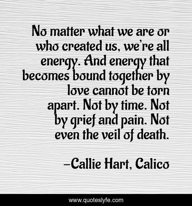 This page presents the quote "No matter what we are or who created us, we’re all energy. And energy that becomes bound together by love cannot be torn apart. Not by time. Not by grief and pain. Not even the veil of death.". Author of this quote is Callie Hart, Calico. This quote is about energy, death, love, affection,.