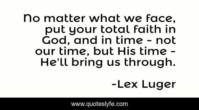 This page presents the quote "No matter what we face, put your total faith in God, and in time - not our time, but His time - He'll bring us through.". Author of this quote is Lex Luger. This quote is about god, time, face,.