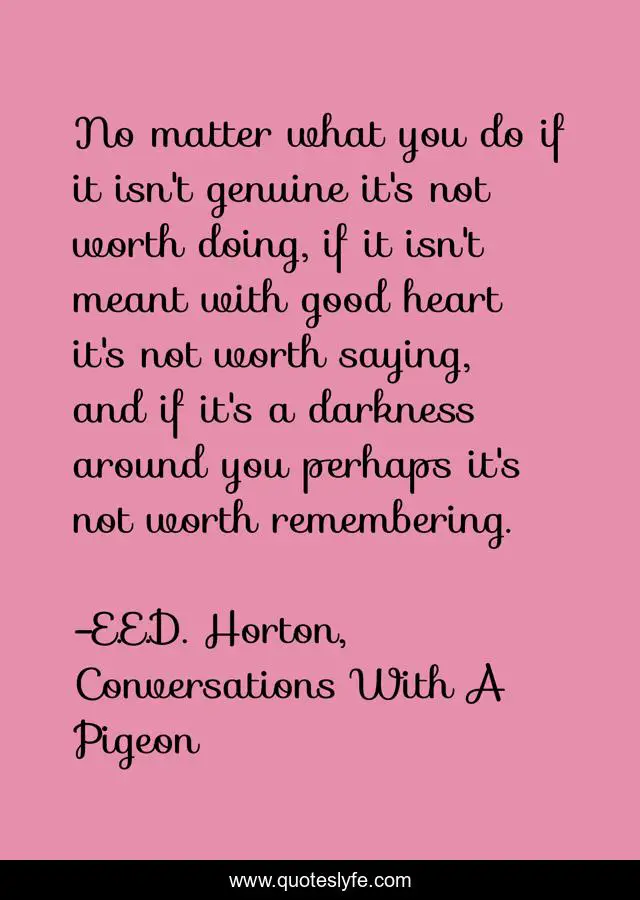 This page presents the quote "No matter what you do if it isn't genuine it's not worth doing, if it isn't meant with good heart it's not worth saying, and if it's a darkness around you perhaps it's not worth remembering.". Author of this quote is E.E.D. Horton, Conversations With A Pigeon. This quote is about pigeons, pigeon, animal-communicator, pets, animal-communication, philosophy-of-life, birds, philosphy,.