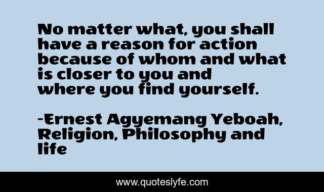 This page presents the quote "No matter what, you shall have a reason for action because of whom and what is closer to you and where you find yourself.". Author of this quote is Ernest Agyemang Yeboah, Religion, Philosophy and life. This quote is about life-issues, offenses, actions, mind-your-mind, thought, reasons-behind-action,.