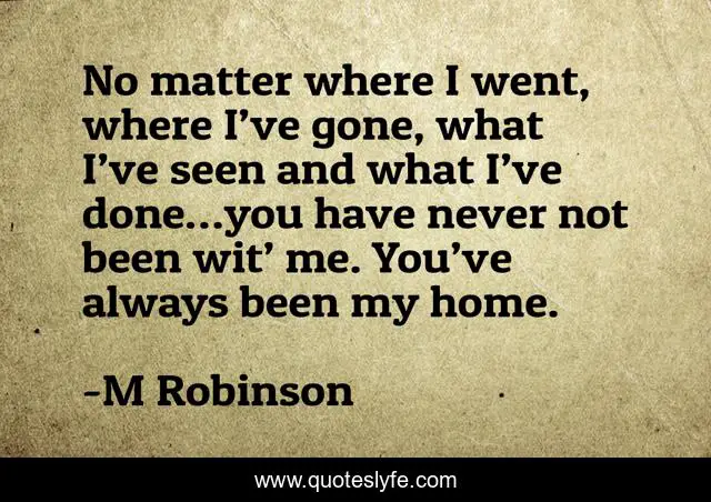 This page presents the quote "No matter where I went, where I’ve gone, what I’ve seen and what I’ve done…you have never not been wit’ me. You’ve always been my home.". Author of this quote is M Robinson. This quote is about alpha-male, death, love, tear-jerker, mc, angst, romance, m-robinson, birth,.
