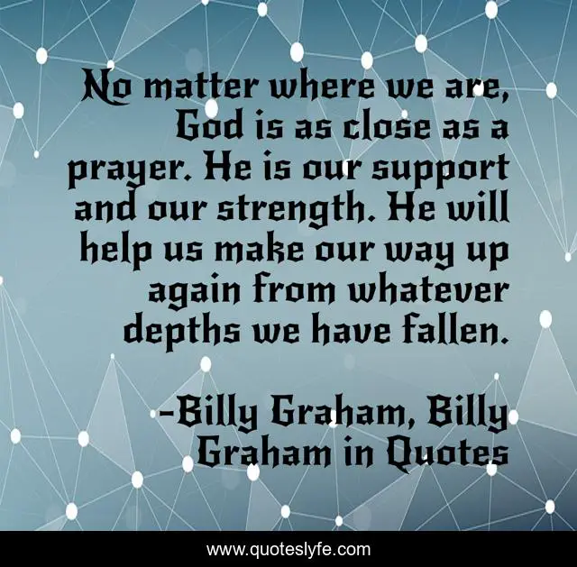 This page presents the quote "No matter where we are, God is as close as a prayer. He is our support and our strength. He will help us make our way up again from whatever depths we have fallen.". Author of this quote is Billy Graham, Billy Graham in Quotes. This quote is about billy-graham, prayer,.