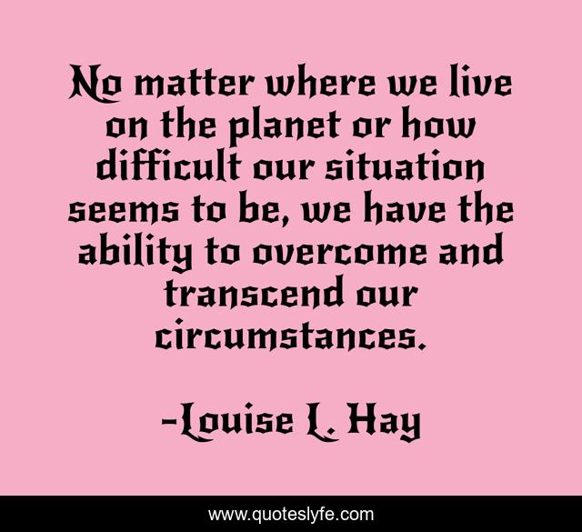 This page presents the quote "No matter where we live on the planet or how difficult our situation seems to be, we have the ability to overcome and transcend our circumstances.". Author of this quote is Louise L. Hay. This quote is about enthusiasm, inspirational,.