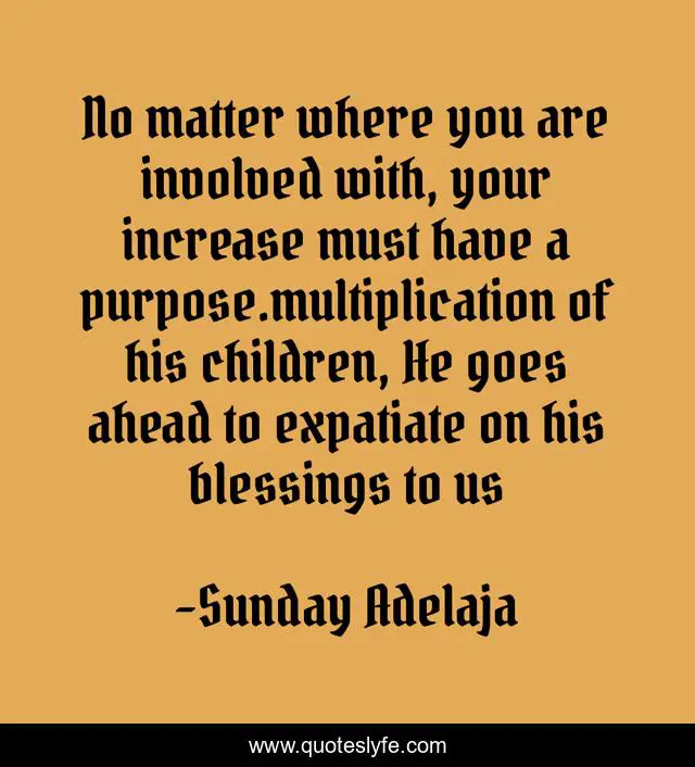 This page presents the quote "No matter where you are involved with, your increase must have a purpose.multiplication of his children, He goes ahead to expatiate on his blessings to us". Author of this quote is Sunday Adelaja. This quote is about his, goes, ahead, no, expatiate, involved, us, increase, matter,.