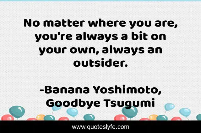 This page presents the quote "No matter where you are, you're always a bit on your own, always an outsider.". Author of this quote is Banana Yoshimoto, Goodbye Tsugumi. This quote is about life, journey, travel,.
