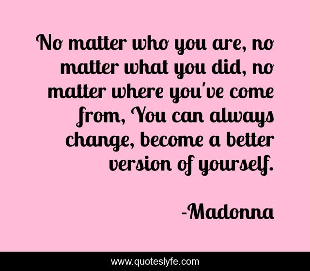 This page presents the quote "No matter who you are, no matter what you did, no matter where you've come from, You can always change, become a better version of yourself.". Author of this quote is Madonna. This quote is about always, quotes-to-live-by, change, inspirational, enthusiasm,.