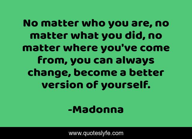 This page presents the quote "No matter who you are, no matter what you did, no matter where you've come from, you can always change, become a better version of yourself.". Author of this quote is Madonna. This quote is about change, enthusiasm, self-improvement, inspirational, self-actualization,.