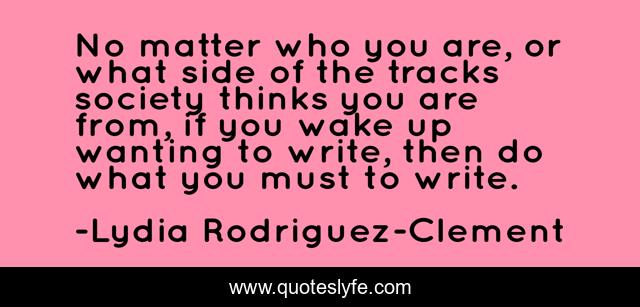 This page presents the quote "No matter who you are, or what side of the tracks society thinks you are from, if you wake up wanting to write, then do what you must to write.". Author of this quote is Lydia Rodriguez-Clement. .