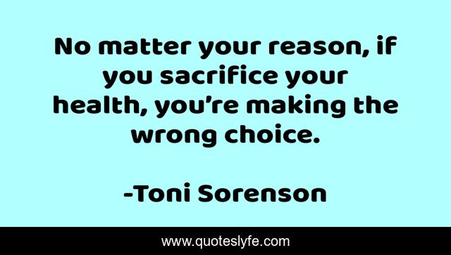 This page presents the quote "No matter your reason, if you sacrifice your health, you’re making the wrong choice.". Author of this quote is Toni Sorenson. This quote is about health, exercise, fitness,.