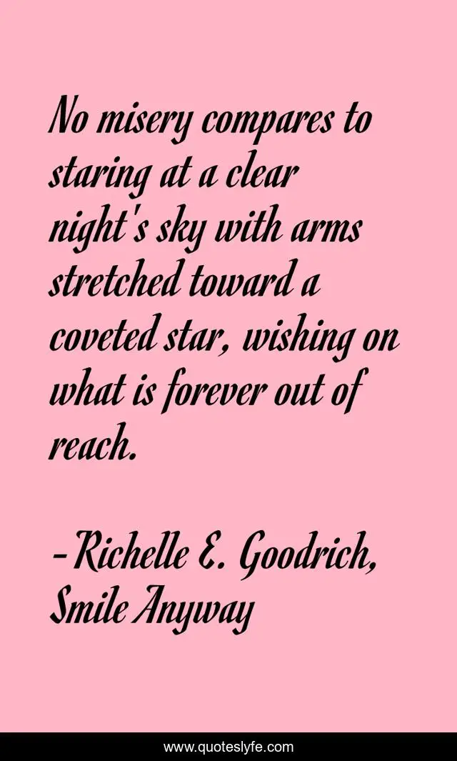 This page presents the quote "No misery compares to staring at a clear night's sky with arms stretched toward a coveted star, wishing on what is forever out of reach.". Author of this quote is Richelle E. Goodrich, Smile Anyway. This quote is about covet, wishing, yearning, richelle, stars, misery, wanting, richelle-goodrich,.