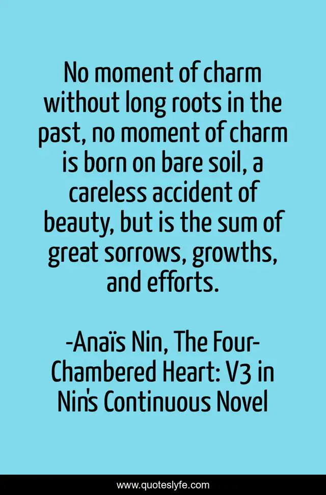 "Anaïs Nin, The Four-Chambered Heart: V3 in Nin's Continuous Novel Quotes." Quoteslyfe.com, 2025. Sat. 06 Dec. 2025. <https://www.quoteslyfe.com/quote/No-moment-of-charm-without-long-roots-43580>.