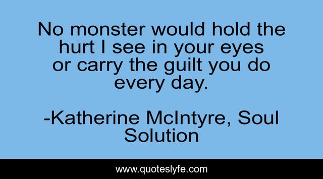 This page presents the quote "No monster would hold the hurt I see in your eyes or carry the guilt you do every day.". Author of this quote is Katherine McIntyre, Soul Solution. This quote is about carrying-guilt, guilt, monster, healing-abuse, redemption,.
