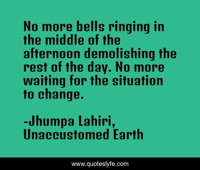 This page presents the quote "No more bells ringing in the middle of the afternoon demolishing the rest of the day. No more waiting for the situation to change.". Author of this quote is Jhumpa Lahiri, Unaccustomed Earth. This quote is about waiting, change,.