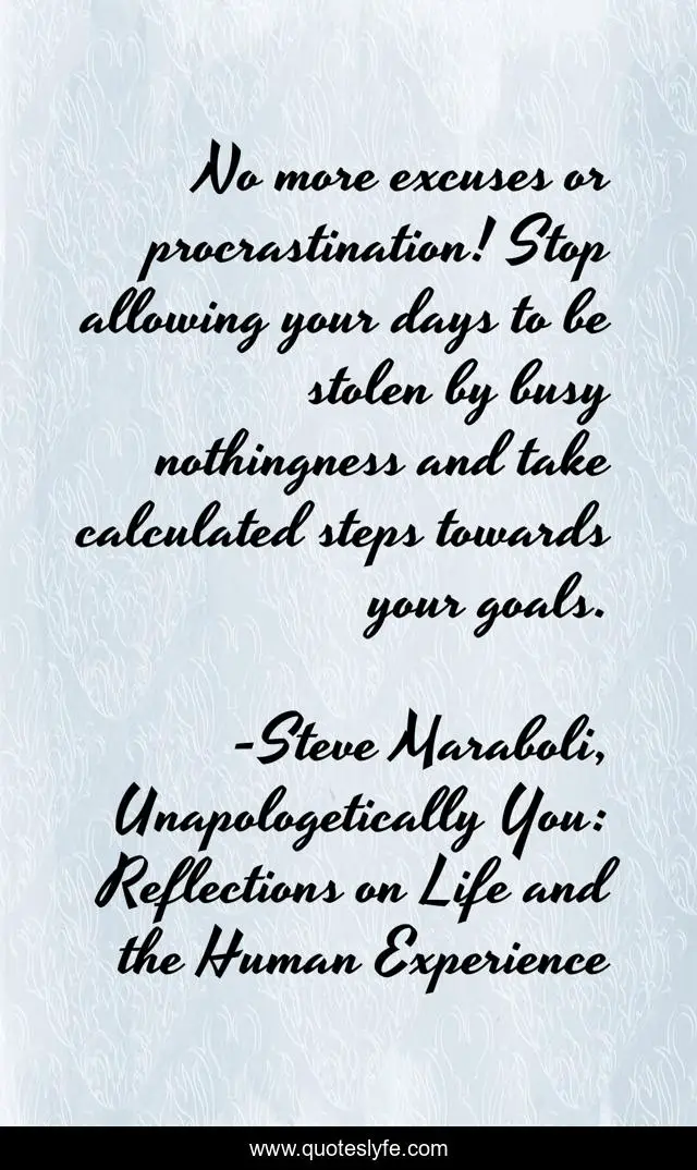 This page presents the quote "No more excuses or procrastination! Stop allowing your days to be stolen by busy nothingness and take calculated steps towards your goals.". Author of this quote is Steve Maraboli, Unapologetically You: Reflections on Life and the Human Experience. This quote is about excuses, goals, success, procrastination,.