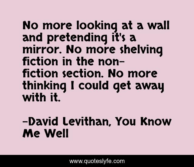 This page presents the quote "No more looking at a wall and pretending it's a mirror. No more shelving fiction in the non-fiction section. No more thinking I could get away with it.". Author of this quote is David Levithan, You Know Me Well. This quote is about coming-out, self-acceptance, self-awareness, library, self-realization,.