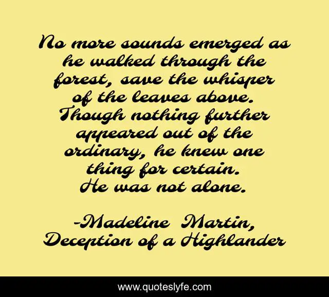 This page presents the quote "No more sounds emerged as he walked through the forest, save the whisper of the leaves above. Though nothing further appeared out of the ordinary, he knew one thing for certain. He was not alone.". Author of this quote is Madeline Martin, Deception of a Highlander. This quote is about highlander-romance, historical-romance, scottish-romance,.