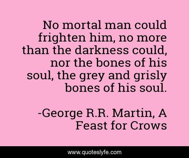 This page presents the quote "No mortal man could frighten him, no more than the darkness could, nor the bones of his soul, the grey and grisly bones of his soul.". Author of this quote is George R.R. Martin, A Feast for Crows. This quote is about george-r-r-martin, quote, a-feast-for-crows,.
