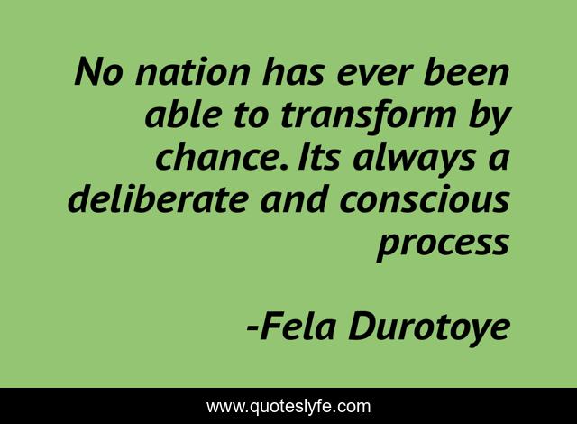 This page presents the quote "No nation has ever been able to transform by chance. Its always a deliberate and conscious process". Author of this quote is Fela Durotoye. This quote is about change, national, africa, nigeria, liberty,.