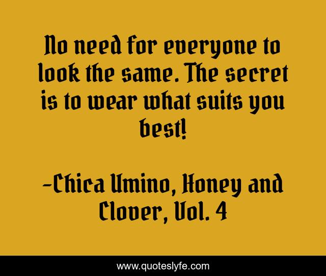 This page presents the quote "No need for everyone to look the same. The secret is to wear what suits you best!". Author of this quote is Chica Umino, Honey and Clover, Vol. 4. This quote is about cute, individuality, fashion, honey-and-clover,.