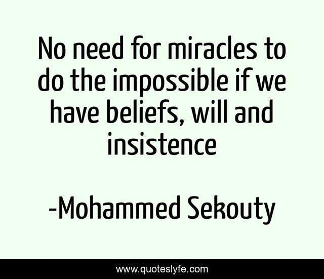 This page presents the quote "No need for miracles to do the impossible if we have beliefs, will and insistence". Author of this quote is Mohammed Sekouty. This quote is about confidence, positive, motivational, miracle, optimistic, inspirational, enthusiasm,.