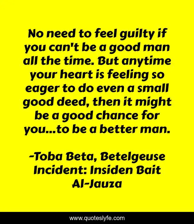 This page presents the quote "No need to feel guilty if you can't be a good man all the time. But anytime your heart is feeling so eager to do even a small good deed, then it might be a good chance for you…to be a better man.". Author of this quote is Toba Beta, Betelgeuse Incident: Insiden Bait Al-Jauza. This quote is about mystery, life, good, chance, better, secret, time, deed, feeling,.