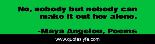 This page presents the quote "No, nobody but nobody can make it out her alone.". Author of this quote is Maya Angelou, Poems. .