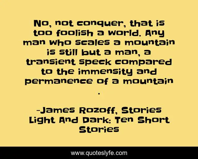 This page presents the quote "No, not conquer, that is too foolish a world. Any man who scales a mountain is still but a man, a transient speck compared to the immensity and permanence of a mountain .". Author of this quote is James Rozoff, Stories Light And Dark: Ten Short Stories. This quote is about mountain, summit, immensity, mountain-climbing,.