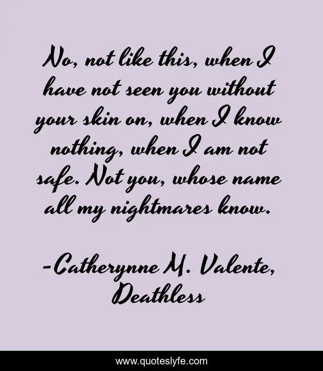 This page presents the quote "No, not like this, when I have not seen you without your skin on, when I know nothing, when I am not safe. Not you, whose name all my nightmares know.". Author of this quote is Catherynne M. Valente, Deathless. .