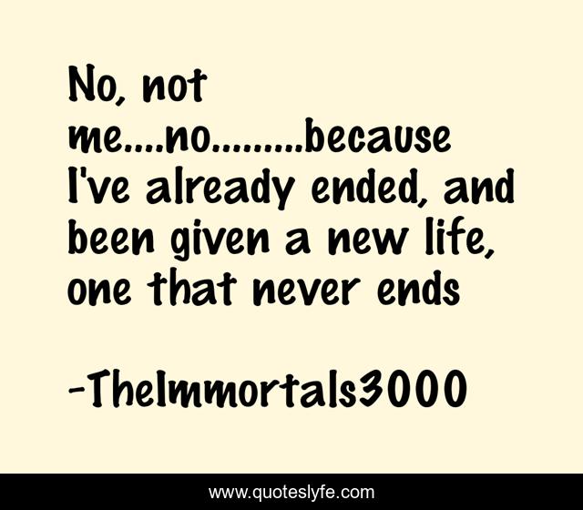 This page presents the quote "No, not me....no.........because I've already ended, and been given a new life, one that never ends". Author of this quote is TheImmortals3000. This quote is about longing-for-death, resentful, vampire,.