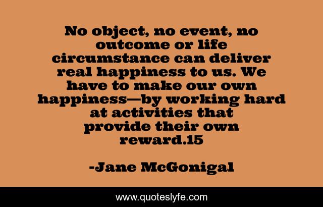 This page presents the quote "No object, no event, no outcome or life circumstance can deliver real happiness to us. We have to make our own happiness—by working hard at activities that provide their own reward.15". Author of this quote is Jane McGonigal. .