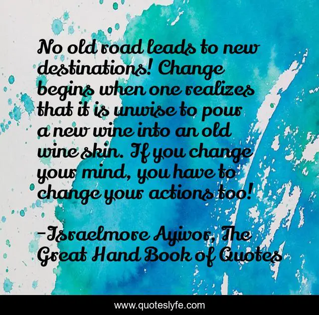 This page presents the quote "No old road leads to new destinations! Change begins when one realizes that it is unwise to pour a new wine into an old wine skin. If you change your mind, you have to change your actions too!". Author of this quote is Israelmore Ayivor, The Great Hand Book of Quotes. This quote is about begins, change-your-mind, food-for-thought, old, israelmore-ayivor, lead, new-wine, destination, pour,.