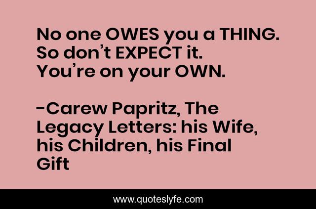 This page presents the quote "No one OWES you a THING. So don’t EXPECT it. You’re on your OWN.". Author of this quote is Carew Papritz, The Legacy Letters: his Wife, his Children, his Final Gift. This quote is about no-one-owes-you-a-thing, carew-s, legacy, the-legacy-letters, carew-papritz, quote, on-your-own, quotes-to-live-by, book,.