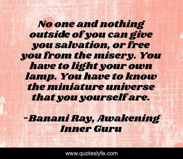 This page presents the quote "No one and nothing outside of you can give you salvation, or free you from the misery. You have to light your own lamp. You have to know the miniature universe that you yourself are.". Author of this quote is Banani Ray, Awakening Inner Guru. This quote is about enthusiasm, awakening, salvation, inspirational, guru,.