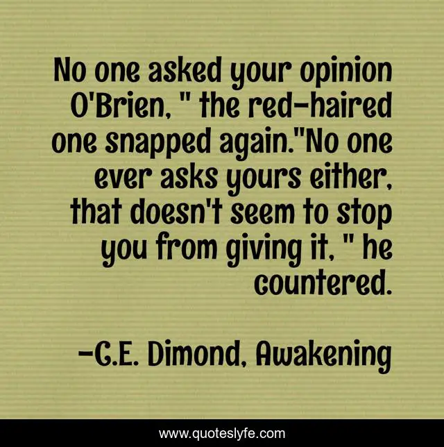 This page presents the quote "No one asked your opinion O'Brien, " the red-haired one snapped again."No one ever asks yours either, that doesn't seem to stop you from giving it, " he countered.". Author of this quote is C.E. Dimond, Awakening. This quote is about fantasy-young-adult, humor, young-adult, fiction,.