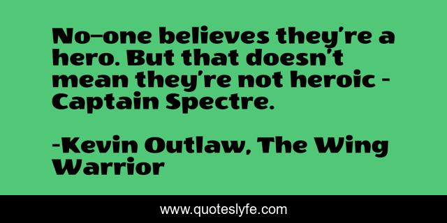 This page presents the quote "No–one believes they’re a hero. But that doesn’t mean they’re not heroic - Captain Spectre.". Author of this quote is Kevin Outlaw, The Wing Warrior. This quote is about the-wing-warrior, books-for-children, fiction, fantasy, adventure, kindle,.