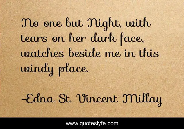 This page presents the quote "No one but Night, with tears on her dark face, watches beside me in this windy place.". Author of this quote is Edna St. Vincent Millay. This quote is about night, poetry, darkness,.