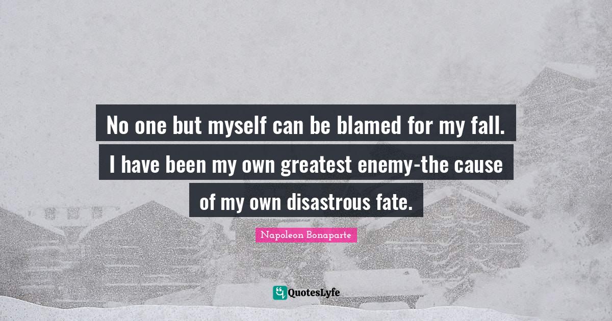 This page presents the quote "No one but myself can be blamed for my fall. I have been my own greatest enemy-the cause of my own disastrous fate.". Author of this quote is Napoleon Bonaparte. This quote is about fate, my own, fall, enemy,.