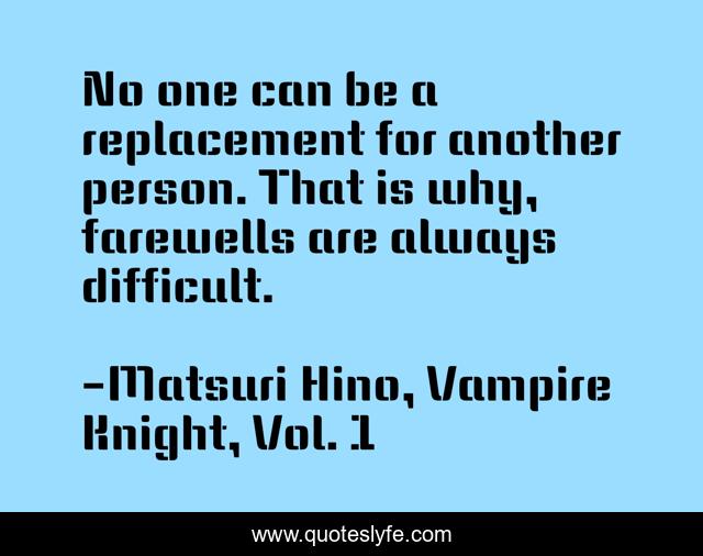 This page presents the quote "No one can be a replacement for another person. That is why, farewells are always difficult.". Author of this quote is Matsuri Hino, Vampire Knight, Vol. 1. This quote is about romance, love, vampire-knight, affection,.