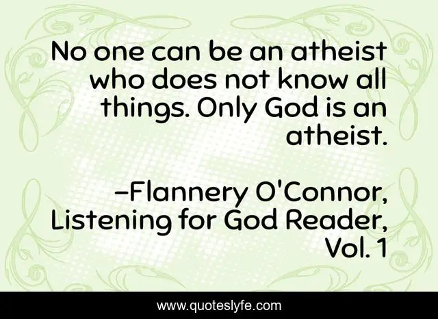 This page presents the quote "No one can be an atheist who does not know all things. Only God is an atheist.". Author of this quote is Flannery O'Connor, Listening for God Reader, Vol. 1. .