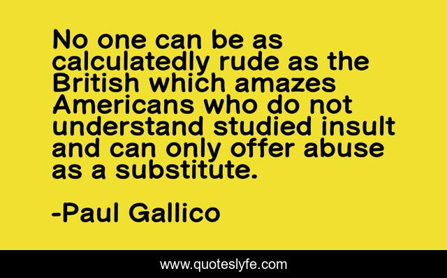 This page presents the quote "No one can be as calculatedly rude as the British which amazes Americans who do not understand studied insult and can only offer abuse as a substitute.". Author of this quote is Paul Gallico. This quote is about , england, k, u,.